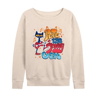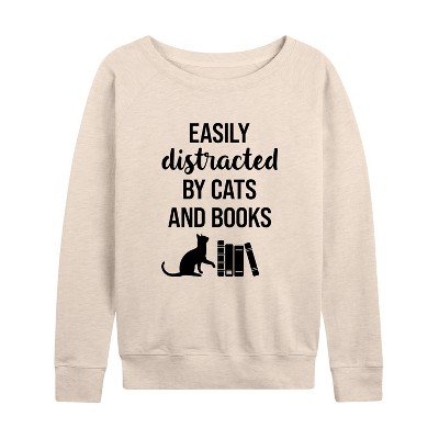 Women's Instant Message Cat Peeking Over Book Stack Lightweight French Terry Wide Neck Long Sleeve Graphic Shirt - Heather Indigo - Small