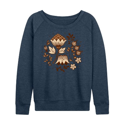 Women's Instant Message Decorative Flowers Lightweight French Terry Wide Neck Long Sleeve Graphic Shirt - Heather Indigo - Medium