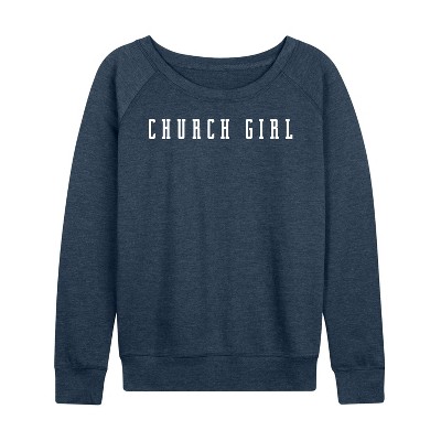 Women's Instant Message Delulu Cursive Lightweight French Terry Wide Neck Long Sleeve Graphic Shirt - Heather Indigo - Large