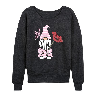 Women's Instant Message Gnome With Tree Lightweight French Terry Wide Neck Long Sleeve Graphic Shirt - Heather Charcoal - Small