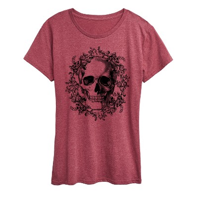 Women's Instant Message Gray Patterned Flowers Short Sleeve Graphic T-Shirt - Heather Burgundy - 1X
