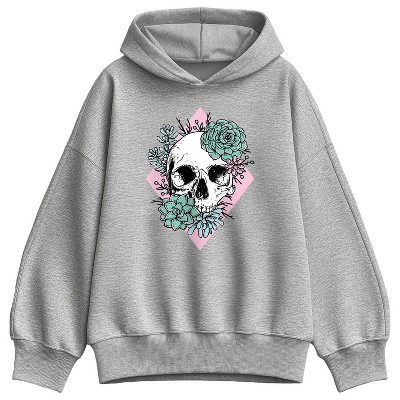 Women's Instant Message Half Skull Half Flowers Oversized Fleece Hoodie Sweatshirt - Athletic Heather - Small
