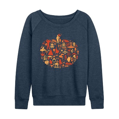Women's Instant Message Muted Plaid Pumpkin Lightweight French Terry Wide Neck Long Sleeve Graphic Shirt - Heather Indigo - Medium
