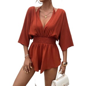 - Women's Casual Romper Button V Neck Flared Sleeve Elastic Wasit Smocked Short Rompers Jumpsuits