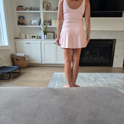 [This review was collected as part of a promotion.] I wear a size medium dress. I have a 36C bust. I have a 32 inch waist and a 36 inch hips. This size medium workout dress fit me perfectly. This workout outfit was so soft and comfortable. It has a built-in bra which is wonderful. It also has spandex underneath the skirt. I loved how comfortable and soft the material of the outfit was. I also really enjoyed the light pink color of the outfit. I received an incentive to write this review.