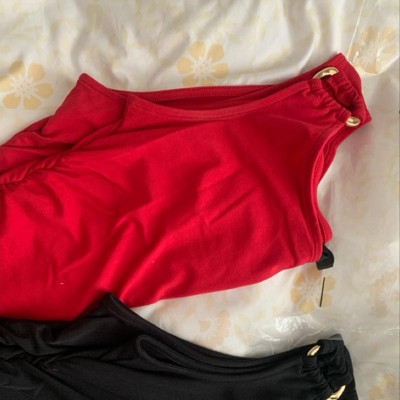 So sad about this dress!! I ordered a small black and medium red to see what I liked better. I generally wear a size 6 but my chest is small and my hips are wide so I ordered both sizes. The medium was just a hair big on the top but I can live with that so I would’ve kept the medium if it weren’t for the arm holes! On both dresses the left armhole is at LEAST a solid inch longer. It’s a shame because I love the shade of red and it really is flattering, but I don’t want one side to be digging into my armpit while the other side looks too big In the photo I folded the dresses in half and lined the necks and shoulder up as best as possible to show how big the difference is