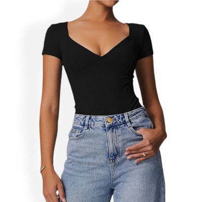 Women's Lace Detail Long Sleeve Bodysuit - Pleated Wrap V-Neck Blouse for Casual & Dressy Occasions Black S