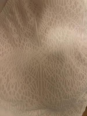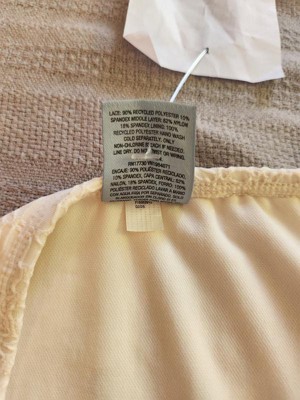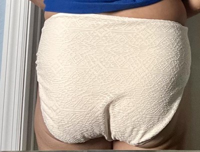 These bikini bottoms are nice and full coverage. There is a lace pattern, which makes it not as plain. The color is more of a cream color, which I prefer. It is true to size and fits me perfectly. It washes well and doesn’t shrink.