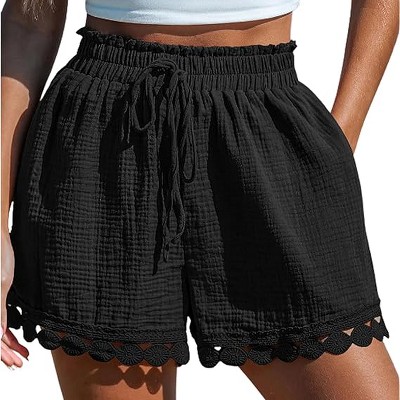 Stylish shorts with contemporary lace trim. * Elastic waistband smocked at the back for added comfort * Inside leg length approx. 3 inches * 100% Viscose. Imported. * Machine wash cold with like colors, inside out * Hang to dry or lay flat