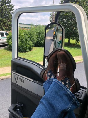 Lightweight comfort doesn't mean lack of style in Lady Rebel Work. This 10 inch Union Flag western steel toe women's western boot features a distressed full-grain leather vamp, fox, collar and pull straps with a brown/union flag colored shaft.You can pull this boot on with ease thanks to the dipped topline and pull straps. Inside, the boot has a soft mesh lining that offers breathability to your feet while the steel shank stabilizes your foot and supports your arch. A removable contoured ventilated cushion footbed offers even more comfort. This square steel toe Lady Rebel Work has a dual-density rubber outsole for a comfortable and secure step and the rolled shank area allows easy placement in the stirrup. It's made with a double-row welt stitch for added durability and has a 1 1/4-inch rocker heel. These boots are compliant with the ASTM F2413 Protective Toe Classification and the ASTM F2413 Electrical Hazard Standard which means your feet are protected from falling debris and keep the bottoms of your feet safe when stepping down on top of electrical equipment. Try this 10 Western Steel toe Lady Rebel style for all day comfort and support for a long day's work. Order a pair today!