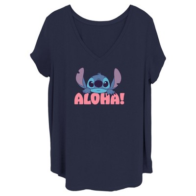 • Enjoy comfort and fashion at the same time with this unique juniors' graphic V-neck plus size tee design from Lilo & Stitch.