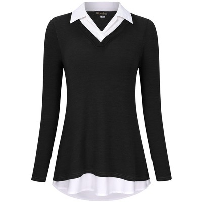 - FEATURES - Stylish Fake Shirt Collar/Short & Long Sleeve/2 in 1 Design/Contrast Color/Layered Look/Curved Hem/Patchwork/Slim fit/Good Stretchy/Work Shirts/Casual Blouse Tops.Unique style, make you look more romantic and elegant.