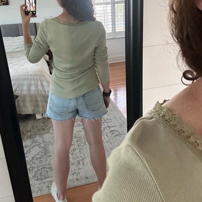 [This review was collected as part of a promotion.] I ordered this long sleeve top for myself in a medium and the light green color. I am 5 foot 7 and typically wear a medium or small in tops. The medium was the right size choice for me, it fit comfortably and the sleeves are a great length. The color is nice, and works well with denim. The lace around the neckline is a little pajama-like. The main issue I had with the lace is that it was already pulled on the top I received so that makes me nervous for its quality and durability. I received an incentive to write this review.