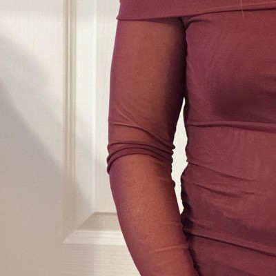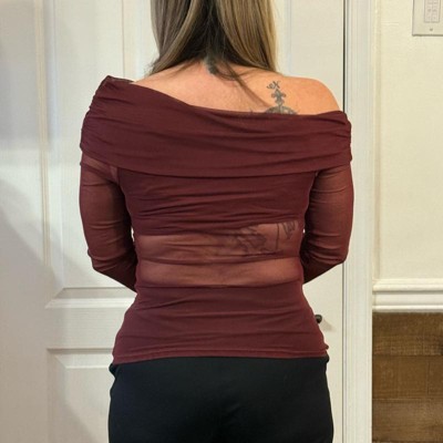 Party T-shirt from Wild Fable™ with an off-the-shoulder neckline, built-in shelf bra and long sleeves. Made from a lightweight mesh fabric blend of recycled polyester and spandex with recycled polyester-spandex blend lining for comfortable stretch that moves with you. Designed in a fitted silhouette with a mid-length cut.