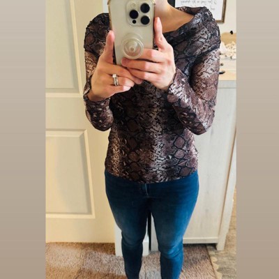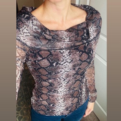 [This review was collected as part of a promotion.] I purchased this women's off the shoulder top in store. This snakeskin top is sheer but it does have a built in layer with a shelf bra so that it isnt see through. The top is cute and looks great for a night on the town. My only problem with this shirt was getting it on and off. It felt extremely small and tight when I was trying to get it on my body. I had to shimmy into the bodice and wriggle my arms into the sleeves. Once I was in it and had adjusted it, it looked ok, but it was a struggle to get it on. I am wearing a size small which is my usual size in tops. I am 5'4" and wear a 34B for reference. The price was reasonable but I wish it was easier to put on.