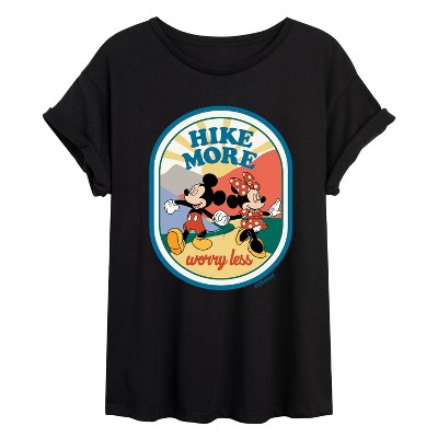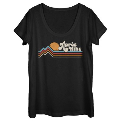 • Strut your stuff with this stylish new juniors' plus size V-neck t-shirt that is perfect for every occasion! Featuring a fun retro graphic with "Apres Hike" in beige lettering along with a blue, red, orange, and white abstract mountain range and a sun across the front.