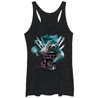 Press play on some awesome tunes and crank up the volume with the Lost Gods Chimpanzee Boombox Heather Black Racerback Tank Top! A chimpanzee rocking colorful sunglasses holds a boombox on his shoulder printed on the front of this funny black chimp shirt.