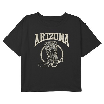 • Strut your stuff with this stylish new juniors' scoop neck t-shirt that is perfect for every occasion! Featuring a fun distressed graphic with "Arizona" and a cool cowboy boot with a spur printed in beige across the front.