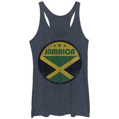 Share your love for the island nation of Jamaica with the Lost Gods Jamaica Flag Circle Heather Green Racerback Tank Top! Three stars are printed in a distressed style next to "Jamaica" and the Jamaican flag within a circle on the front of this cool green Jamaica shirt.