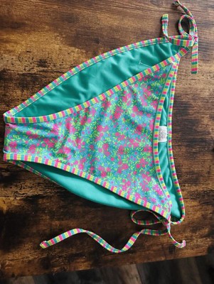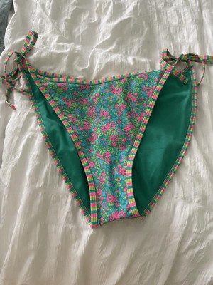 Green bikini bottom from Wild Fable™ features floral print and contrast binding for an elevated look. Tailored of recycled polyester-spandex blend fabric with four-way stretch and elastic at leg openings for flexible comfort all through your activities. Low-rise design with side ties offers a secure fit. Helps provide cheeky coverage.