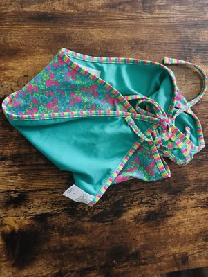 Vibrant beautiful colors! This bathing suit is gorgeous . The outside is a fun floral and all the edges are lined with stripes of the same colors. The inside is a solid green. Tie stings on the sides so it’s adjustable