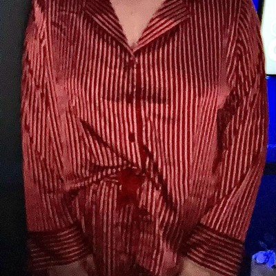 Appreciate a pretty set with long sleeves. Fabric is soft and silky. Size small is a relaxed fit that drapes nicely, similar to the model photo. The sleeve length is perfect for long arms.