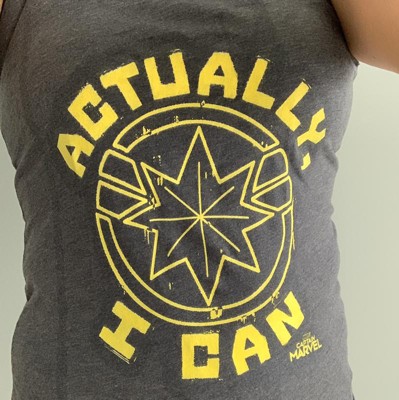 Never underestimate Captain Marvel or the Marvel Captain Marvel Captain Marvel Actually Can Quote Women's Racerback Tank Top! The yellow text "Actually I Can" is printed in bold yellow down the front of this soft Captain Marvel tank top.