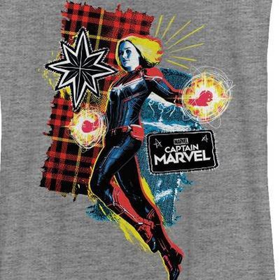 You may not be able to have Captain Marvel's awesome superpowers, but you can have her super fashion with the Captain Marvel Flannel Patch Women's Racerback Tank Top. A cool denim and flannel print patch portrays Captain Marvel on this unique women's Marvel tank top.