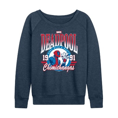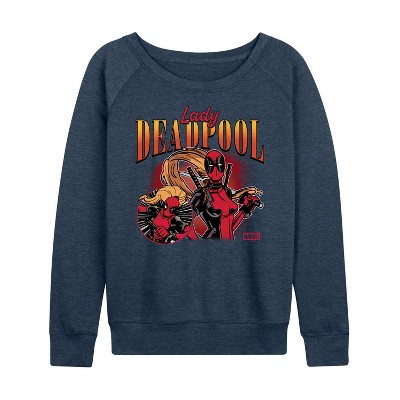Women's Marvel Deadpool Extra Naughty Lightweight French Terry Wide Neck Long Sleeve Graphic Shirt - Heather Indigo - Medium