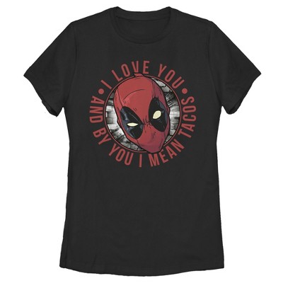 Get ready for some chimichangas and tacos with a side of awesome Marvel Deadpool shirts! This Women's Deadpool Shh… No One Cares Logo Graphic T-Shirt features Deadpool's logo with the phrase: "Sshhhh No One Cares" printed around it in white lettering. Wade Wilson may not be the prettiest hero around, but he's definitely the funniest! Get a hilarious style with your favorite anti-hero, the Merc with a Mouth, before Deadpool goes and sells them all for more tacos!