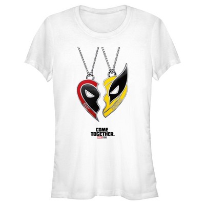Get excited for the highly anticipated Marvel film Deadpool & Wolverine with new officially licensed apparel for the whole family featuring the unlikely duo! Join Deadpool once again as he is pulled from his quiet life to set out on a mission that will change the history of the MCU alongside Wolverine with this Women's Deadpool & Wolverine Best Friends Necklace Poster Graphic Racerback Tank Top featuring red and yellow best friends necklaces with half of Deadpool and Wolverine's faces forming a heart, along with the phrase: "Come Together." in black lettering below. Get ready for a clash of wit and claws like never before with this exclusive Deadpool & Wolverine apparel!