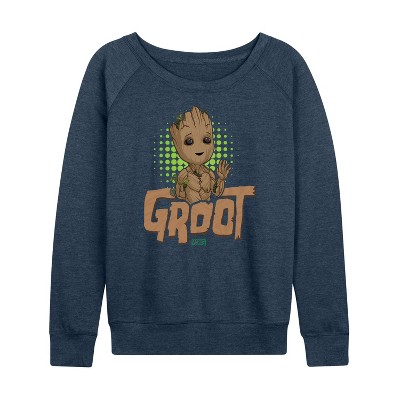 Women's Marvel Guardians of the Galaxy Groot Characters Lightweight French Terry Wide Neck Long Sleeve Graphic Shirt - Heather Indigo - 2X