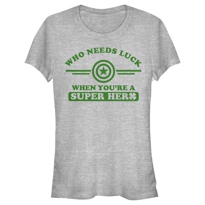 It's your lucky day because you've got an entire team of superheroes to make sure you don't get pinched with this awesome officially licensed Marvel St. Patrick's Day Iron Man No Luck Needed Women's Tee. This cool tee features Iron Man's Face in the center with "Who Needs Luck When You're A Superhero" printed across the front.
