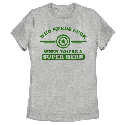 It's your lucky day because you've got an entire team of superheroes to make sure you don't get pinched with this awesome officially licensed Marvel St. Patrick's Day Iron Man No Luck Needed Women's Tee. This cool tee features Iron Man's Face in the center with "Who Needs Luck When You're A Superhero" printed across the front.