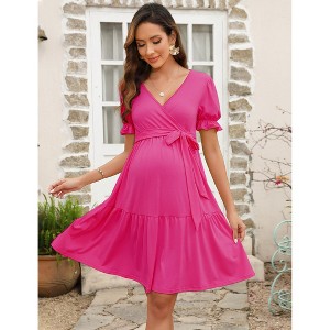 Women's Maternity Dress Puff Short Sleeves V Neck Dresses Casual High Waist A Line Solid Color Midi Dress with Belt Rose Red XX-Large