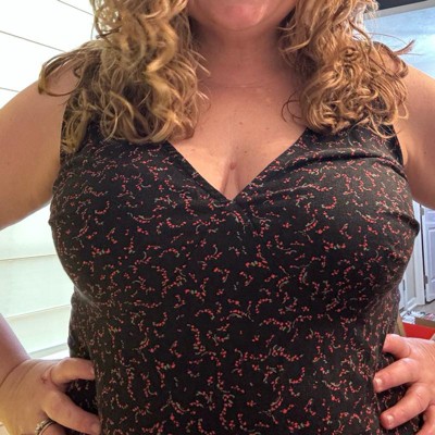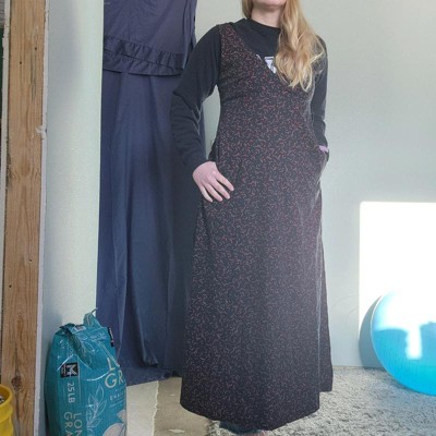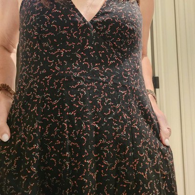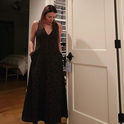 [This review was collected as part of a promotion.] I purchased this women's dress online. This black sleeveless maxi dress has the tiniest red floral print that is actually quite pretty. The dress has a deep v neck bodice with defined cups. The straps are wide enough to wear a regular bra with, which i truly appreciate. The dress has pockets (which i love) and an a-line skirt. I did not feel like this dress was very flattering on. It looked kind of grumpy when it was on. The material is pretty thick and heavy, so when worn with a jacket or sweater it can be suitable for winter. I'm wearing size small and it's true to size. I typically wear a 2-4 in dresses. I am 5'4" and approximately 120 lbs. This was an average price for a maxi dress. The style was just ok. Nothing fantastic about it, rather boring.