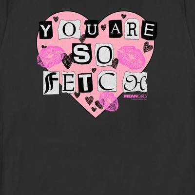 Get in the Valentine's Day mood with this officially licensed Women's Black Mean Girls You Are So Fetch Tee! Featuring the Mean Girls movie quote "You Are So Fetch" in cut-out letters with a big pink heart, you are sure to attract all the Mean Girls fans and maybe even snag a cute Valentine! Dress in style this season with this new graphic tee!