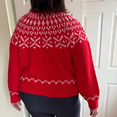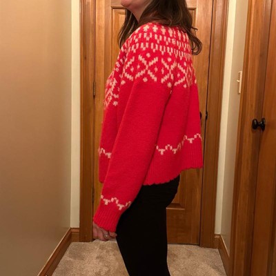 I love this sweater! Very festive! I wore it yesterday and while boarding a plane my husband overheard another passenger say, “She looks like she could be in a Hallmark movie.” I’m giving it 4 instead of 5 bc it is a little itchy but I wore a long sleeve crewneck shirt under and I was fine!