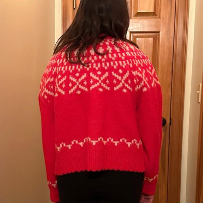 [This review was collected as part of a promotion.] I am 5’4 and about 140 pounds. I typically wear a size medium which is what I tried on in this cardigan. Overall I really like this! It is oversized in a good way. It is so cozy and the bright red fairisle is the perfect festive print. My only criticism is that the fabric feels very hot. I wish it were cotton or wool.