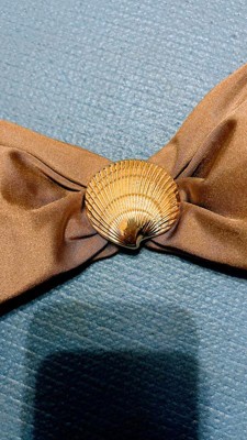 Brown is not the usual go to colour when you think of a bathing suit but this works. The cute gold detailing on the removable straps and shell are exquisite. The only thing I did not like is the inside of the shell piece( see photo). I wish it was covered for added comfort.
