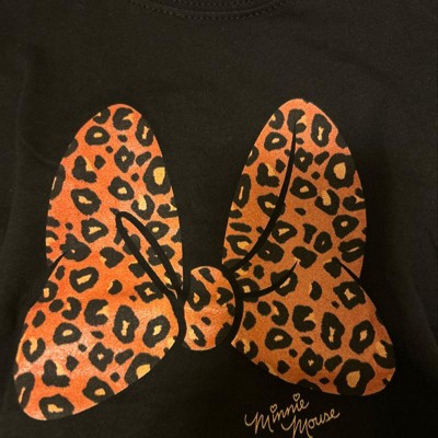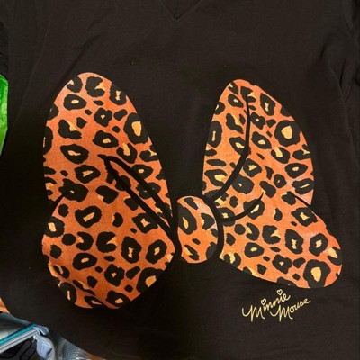Women's Mickey & Friends Mickey & Minnie Mouse Cheetah Print Bow Signature Scoop Neck - Black - Medium