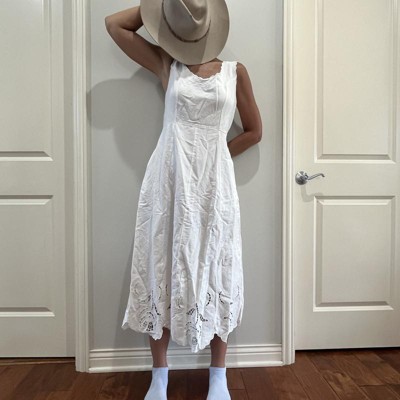 Elegance meets comfort in this Midi A-Line Dress from Universal Thread™. Made of cotton-blend fabric, this sleeveless dress features a scalloped detailing around the neck, shoulder sleeves, and hem, and is adorned with eyelet design on the bottom for a timeless look. It is fashioned in a scoop neckline and boasts a smocked back for a customizable fit. Accessorize it with your choice of sandals and a handbag to complete the ensemble.