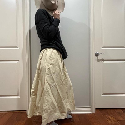 [This review was collected as part of a promotion.] I ordered this skirt in a size medium. The fit on it is great. It has a nice elastic waistband that sits comfortably on the waist and stays in place. It doesn’t shift or roll around. The length of this is perfect. It comes all the way down to the ankles for full coverage. The material is thick and not see-through. It’s a nice beige, soft pastel yellow type of color. It pairs nicely with just about any neutral color top and it’s a very retro style skirt. I love it. I received an incentive to write this review.