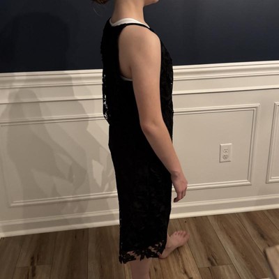 [This review was collected as part of a promotion.] This had a pretty floral overlay and a demure length to the dress and a high neckline which would be great for a professional setting . It fit comfortably all around but the only drawback was that the armpit holes felt too large and was ill fitting even with the XS size. That is probably the only reason it will be returned . Otherwise it’s great for school events and great quality and heft to the fabric. I received an incentive to write this review.
