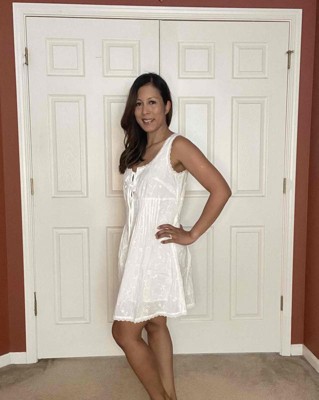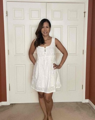 [This review was collected as part of a promotion.] This is a white eyelet trimmed dress with cute lace details around the edges. It has two ties on the front to make bigger or tighter and the back has a fabric strap you can tie to make it tighter. This dress ran kind of wide and loose. This is an extra small and for size reference , my daughter is 17 years old, where is a size extra small or small and weighs approximately 115 lbs. She’s 5ft 3in and this dress was very big on her. I received an incentive to write this review.