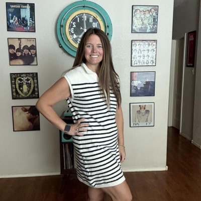 [This review was collected as part of a promotion.] This mini sweater dress from Universal Thread makes me want to pack a bag and head to the Hamptons or Cape Cod. The dress is so chic and trendy and looks and feels expensive. The jersey fabric is really comfortable. The stripes give it that nautical feel. The fit of the dress is really nice and true to size and I’m wearing my usual size large. My measurements are 33 inch waist and 41 inch hips. I received an incentive to write this review.