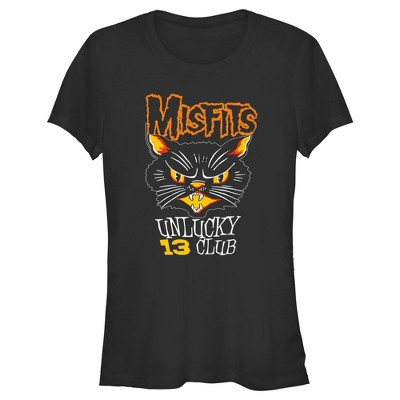 Celebrate the legendary horror-punk band and pop culture icons, The Original Misfits with officially licensed apparel featuring the classic "Fiend Skull" and more! This Women's Misfits Unlucky 13 Club Cat Graphic T-Shirt features a large black cat along with the Misfits logo outlined in orange and the phrase: "Unlucky 13 Club" across the front. Rock out to the genre-defining Misfits in ultimate style with these fun new tees for everyone!