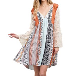 A flattering yet comfortable dress you'll be reaching for season after season.Boho-inspired piece in a vibrant orange hue. Charming dress showcases long lace bell sleeves and deep V-neckline. All wrapped into a flattering full-cut A-line silhouette. Crafted with a composition of 100% Rayon and trim of 50% Cotton, 50% Nylon. Measures 34" in length. With a convenient pull-on closure. Recommended to hand wash this dress to maintain its delicate charm.