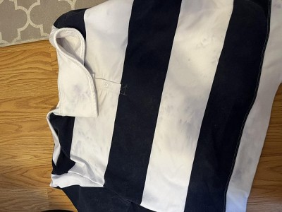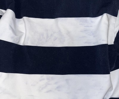 The navy blue runs all over the white when washed. I just don’t understand why this color running would be an issue on a striped shirt?