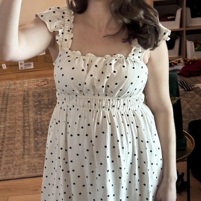Super cute, flattering dress. I am pregnant and wore it with a second trimester belly and it was perfect. I ended up sizing down for some reason- I got a small instead of a medium- and I think that the more fitted look around the bodice looked nice. I’m 5’4” and currently around 155 lbs. I love the feminine touch the ruffle sleeves add.
